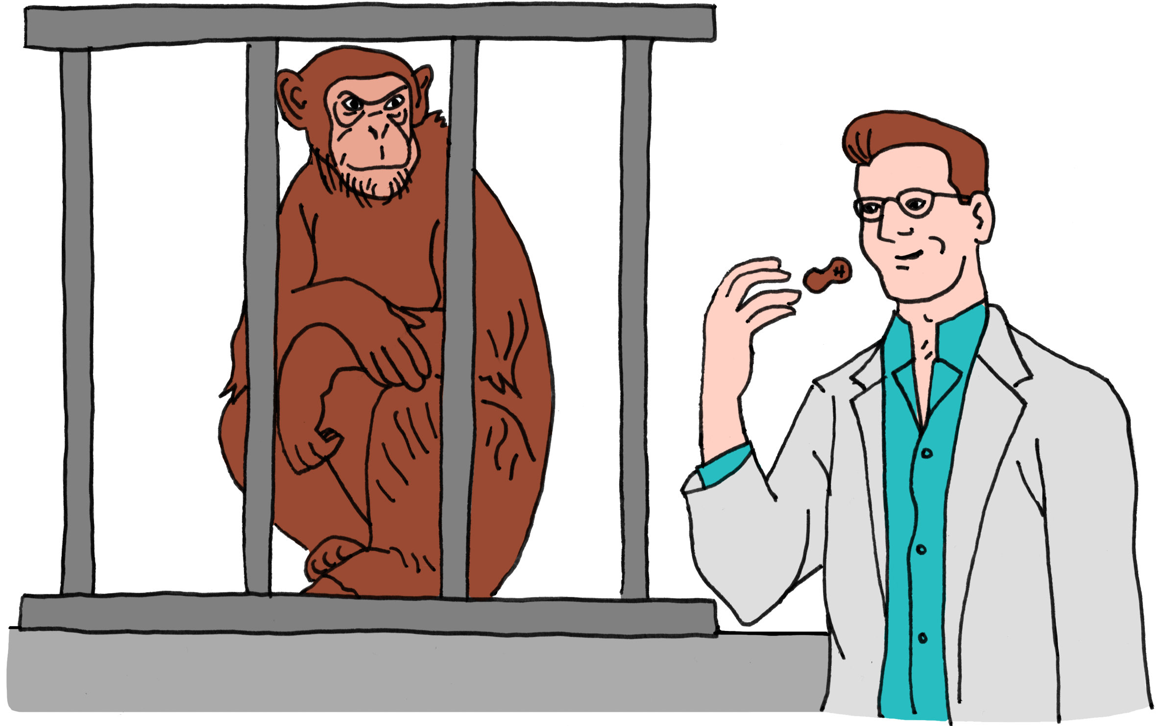 One day, a hungry researcher ate one of the monkey's nuts. The monkey started hootin' and hollerin' and baring his fangs.